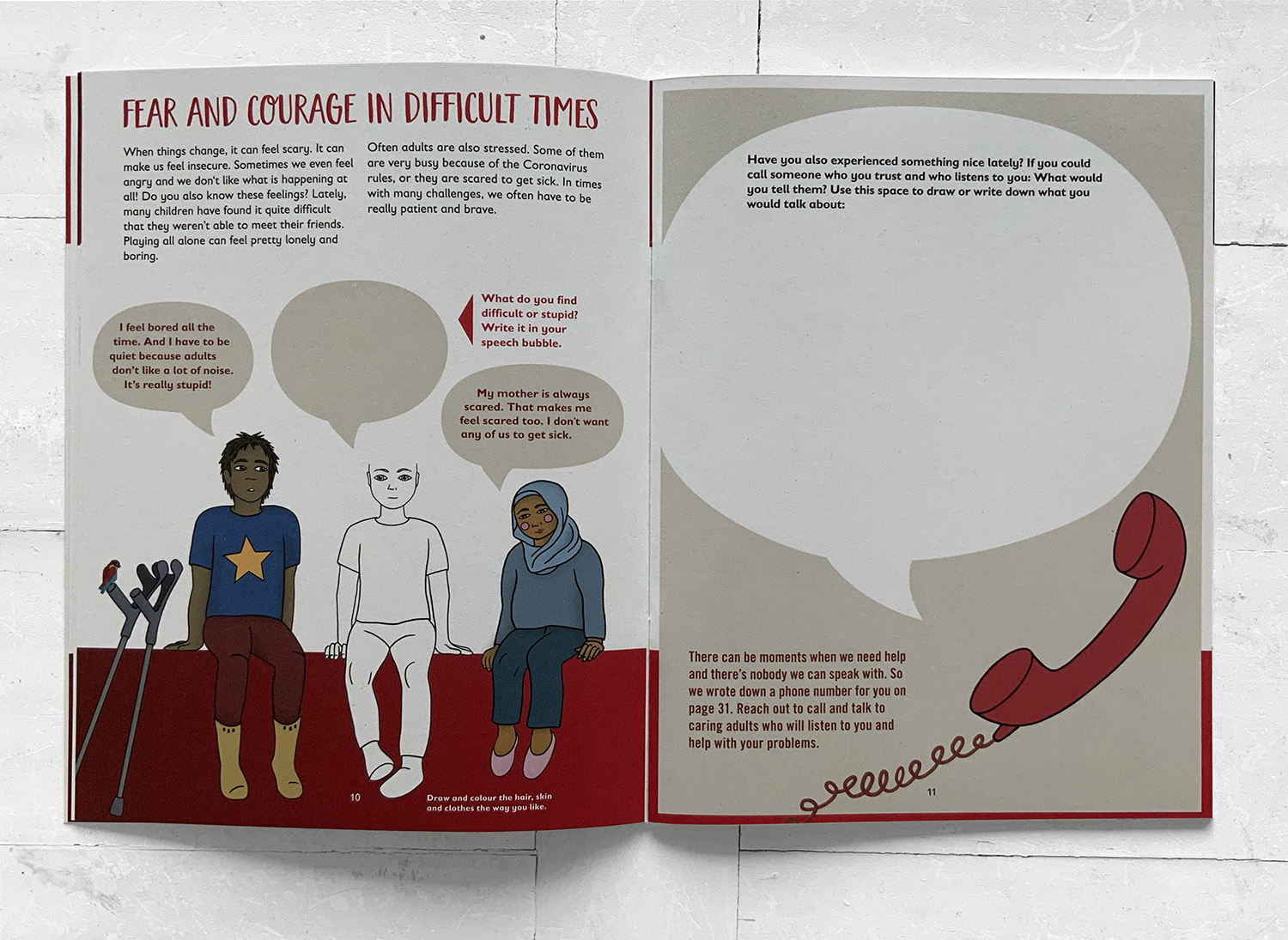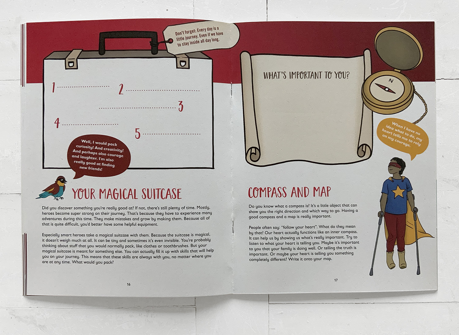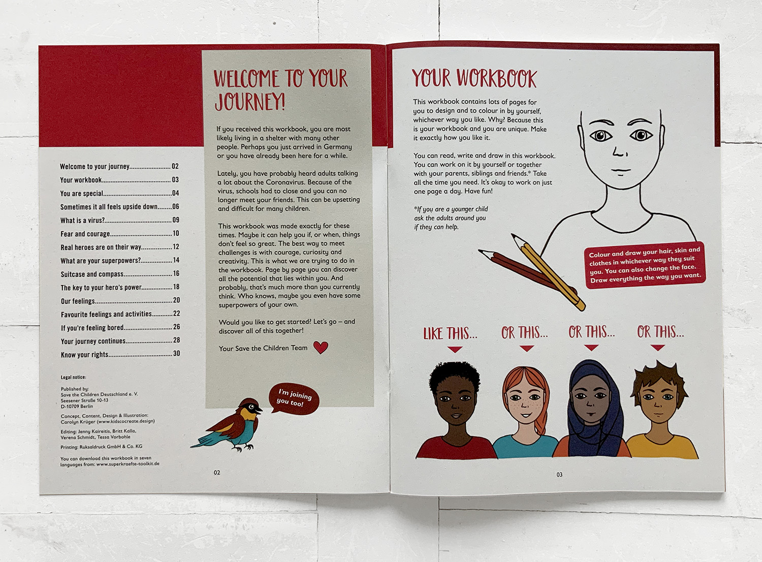 Save the Children Deutschland decided to develop a toolkit with psychosocial and empowering activities for children aged 6 to 12 years. It consists of a workbook and different art materials. The workbook is translated into seven different languages and can be downloaded on www.superkraefte-toolkit.de